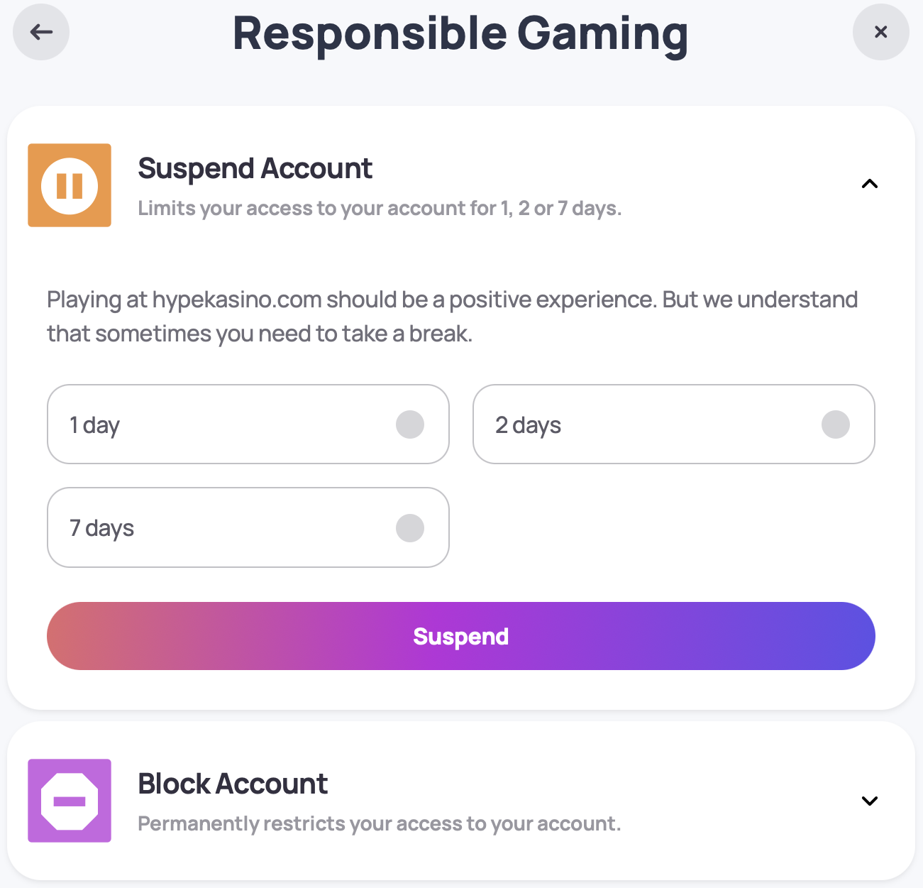If you would like to close your account for a longer period, please email us at support@hypekasino.com, and we will do our best to help you!